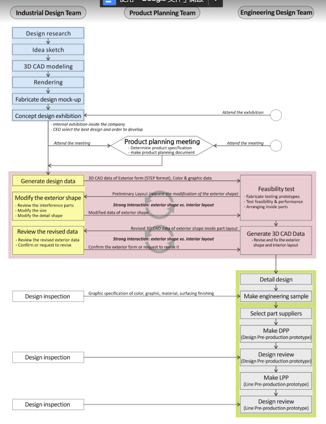 流程塊中的流程從初始輸入開始,並在內部的各個小階段中運行。迭代或反饋可能在塊內的各個小階段之間發生。最後,他們對最終結果做出最終決定。這是一個里程碑,指示該階段將跳到下一階段。例如,在圖3的藍色方框中,此塊的主要工作是開發執行六個小階段的設計概念。當他們處於渲染階段時,如果在渲染評估事件中不滿意渲染結果,則可以返回到構思草圖階段。