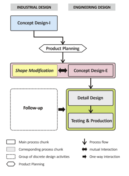 圖5是圖3的簡化版本。圖3中的彩色框使用了圖5中的相同彩色框進行了簡化。圖3中的藍色框變為“ Concept Design-I”。圖3中的“產品計劃會議”定義為“產品計劃”,並以細長的六邊形可視化。由於它是一個單獨且獨特的設計活動,因此被確定為單個階段。在紅色塊內部,有兩個並行的處理塊;右側的“ Concept Design-E”(紅色的小方框)是“主流程塊”,左側的“形狀修改”(黃色)是“對應的塊”。這兩個塊不視為單獨的階段,因為它們與紅色大塊內的起點到終點相連。這樣,兩個設計師團隊之間的互動就很強。為了區分兩個平行的塊,我們用粗實線表示主塊,並用淺實線表示相應的塊。在綠色塊中,由於所有12個流程之間的設計活動都沒有什麼區別,因此我們將詳細設計,測試和生產的兩個順序流程塊合併為一個。因此,在本研究中我們將它們視為一個階段。當綠色方框中的設計過程繼續進行時,工業設計師會根據工程設計師的要求或他們自己的設計檢查目的不時做出反應。他們通常將這些活動稱為“跟進”,與主要任務有所不同。這些活動顯然存在,但不屬於流程塊。它們是如圖3所示的離散過程元素,因此用虛線表示。為了幫助視覺理解,實心箭頭,雙向寬箭頭和單個方向寬箭頭分別表示過程流,相互交互和單向交互。